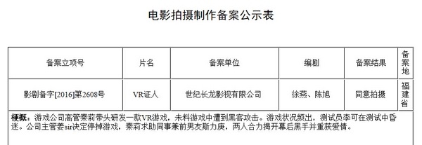 最近,VR异常火爆,各家公司都纷纷公布了与之相关的项目,如今,VR已经成为了电影题材,并且直接被写进了片名中。在立项公示中,有一部名为《VR证人》的电影,该片以一款VR游戏被黑客攻击为开端,引出了隐藏着的阴谋。