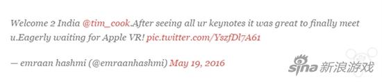 Emraan Hashmi在推特上上传了自己与库克的合照,然后,他还表达了自己非常渴望看到Apple VR是什么样子的。